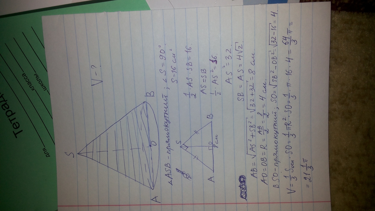 осьовий переріз конуса - прямокутний трикутник з площею 16см². знайти об'єм конуса.