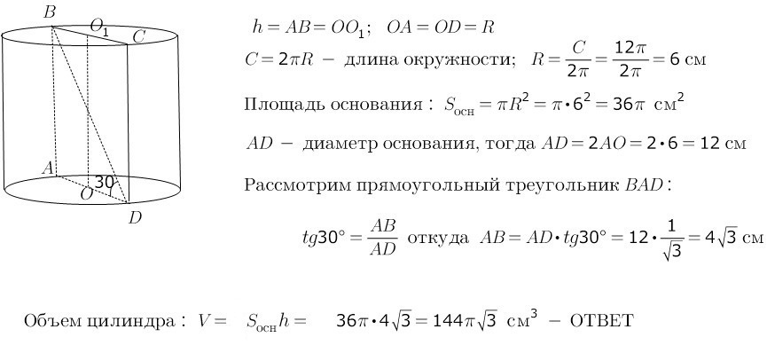 Длина окружности основания цилиндра равна 12п см .Диагональ осевого сечения образует с плоскостью основания цилиндра угол 30 градусов.Найти объем цилиндра.