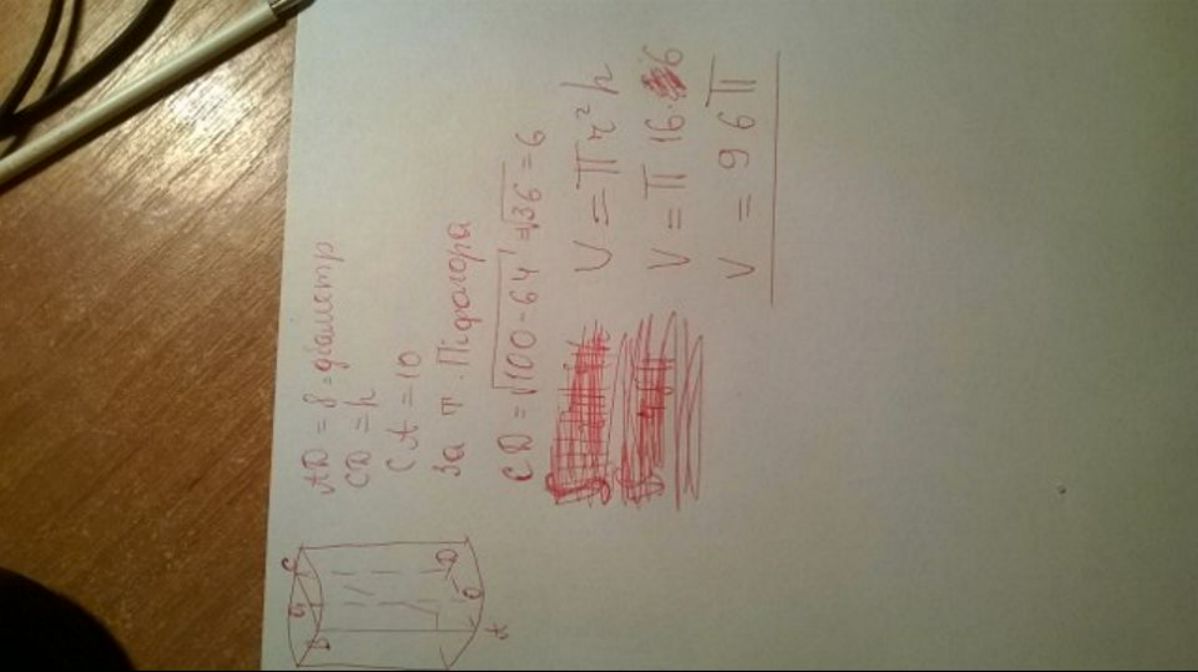 знайдіть обєм циліндра ,в якому діагональ осьового перерізу = 10 см,якщо радіус основи становить 4см