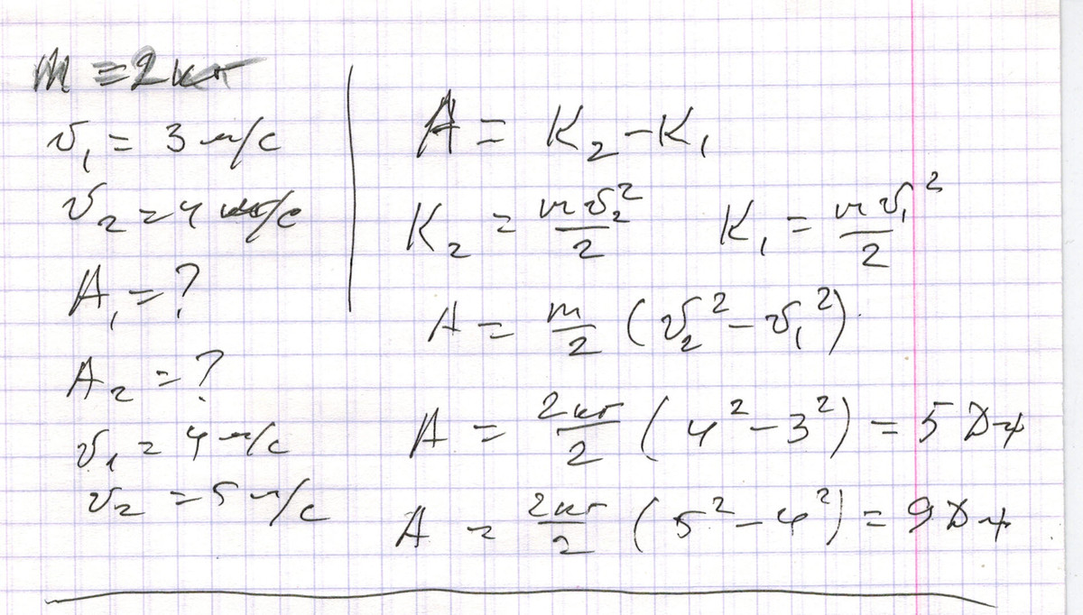 Тело массой m2 кг движется со скоростью ύ1=3 м/с. Какую работу надо выполнить, чтобы увеличить скорость тела до ύ2=4 м/с? Вычислить работу, которую надо совершить, чтобы скорость увеличилась от ύ1=4 м/с до ύ2=5 м/с.