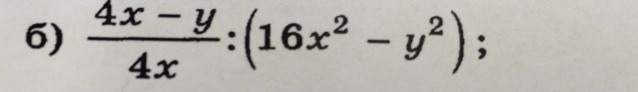 4x-y внизу 4x : (4x-y)(4x+y) равно 4x-y внизу 4x * вверху 1 внизу (4x-y)(4x+)=4x(4x+y)=16xкадрат+4xy