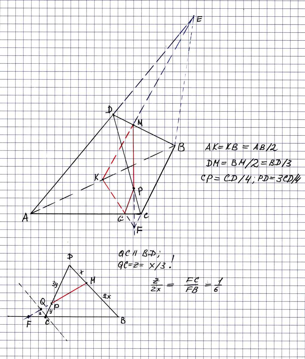 В треугольной пирамиде ABCD на ребрах AB BD и DC взяты соответственно точки K,M и P. так что ak/kb=1 bm/md=2 dp/pc=3. Через точки K,M и P проходит плоскость, пересекающая прямые AD BC CA в точках E F и G. Найдите AE/ED BF/FC CG/GA