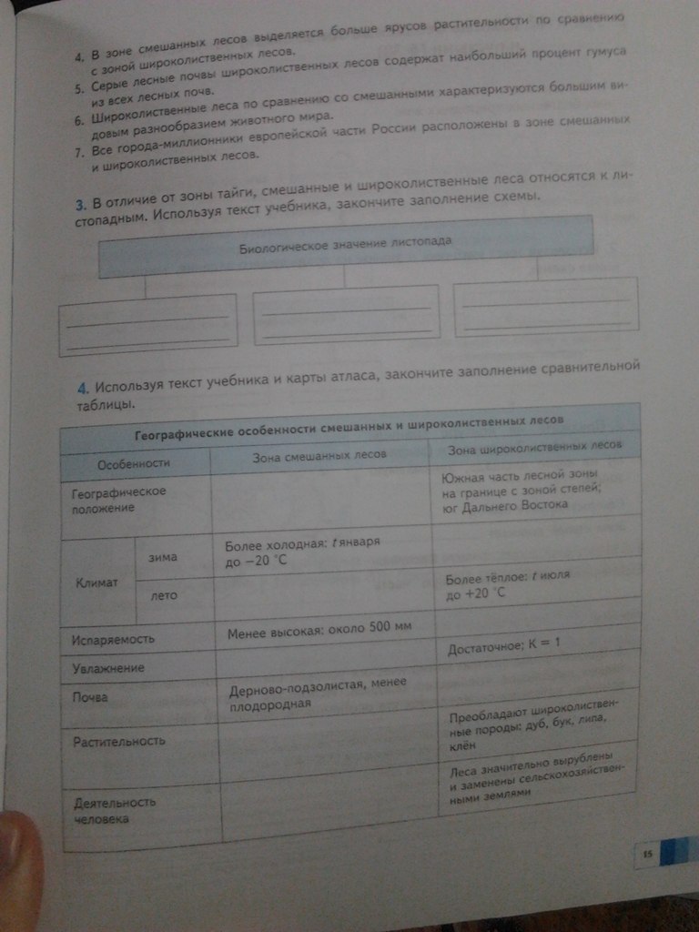 3. 1. Предотвращение отламывания веток под тяжестью снега и из-за сильного ветра. 2. Помощь в обмене веществ растения. 3. Уменьшение испарения влаги (это важно и для растений средней полосы). 4. Смешанные леса расположены на Восточно-Европейской и Западно-Сибирской равнине, на Дальнем Востоке, в Юго-Восточной Азии, в Новой Зеландии. Климат широколиственных лесов зимой: средняя температура -7 градусов. Климат смешанных лесов летом: средняя температура 10-15 градусов. Испаряемость в широколиственных лесах примерно 200 мм. Увлажнение в смешанных лесах достаточное: К > 1. Почвы широколиственных лесов: серые, темно-серые, бурые лесные, подзолистые. Растительность смешанных лесов: ель, сосна, клен, ясень, дуб, пихта, лиственница, береза. Деятельность человека в смешанных лесах: промышленная вырубка, создание заповедников, сбор грибов и ягод.