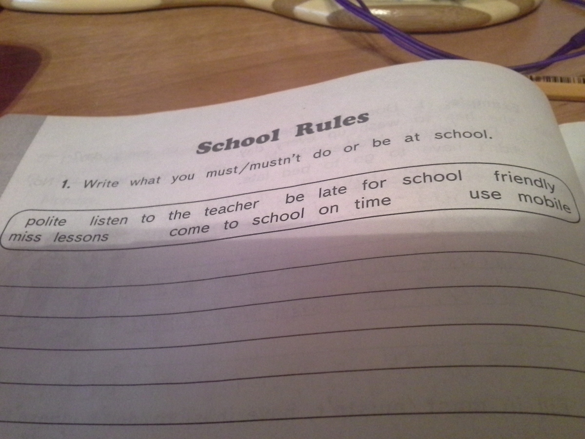 Must be polite, must listen to the teacher, must not be late for school, must be friendly, must not miss lessons, must come to school on time, must not use mobile