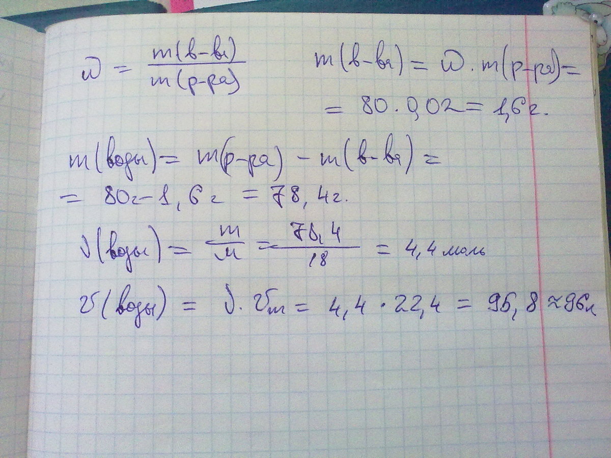 масса раствора поварённой соли(NACL) равна 80 г с массовой долей хлорида натрия(NACL) 2%.ВЫЧИСЛИТЕ МАССУ СОЛИ(NACL) И МАССУ ВОДЫ И ОБЪЁМ ВОДЫ.
