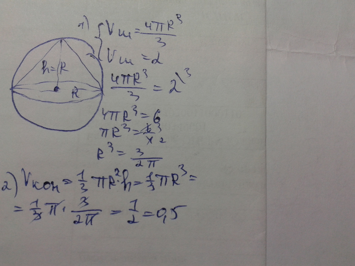 Конус вписан в шар. Радиус основания конуса равен радиусу шара.Объём шара равен 2. найдите объём конуса.