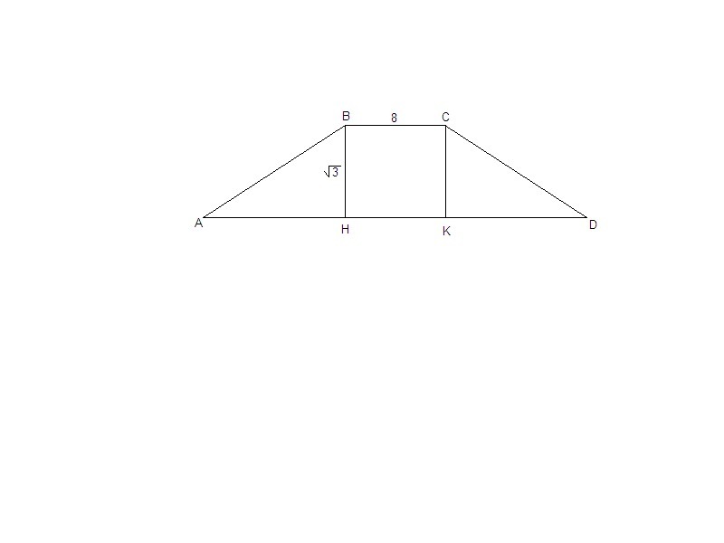Sabcd = (AD + BC)/2 · BH = (14 + 8)/2 · √3 = 11√3 кв. ед.