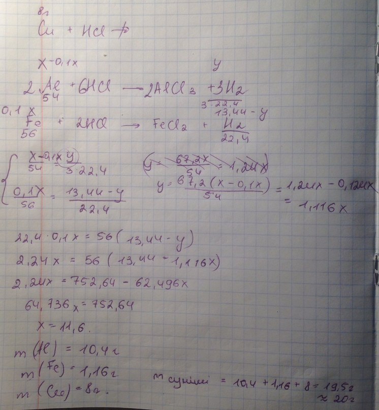 Під час дії на сплав, що містить залізо, мідь та алюміній, в якому масова частка заліза - 10%, надлишком хлоридної к-ти виділилось 13, 44л газу й залишилось 8 г нерозчинного залишку. Визначте масовий склад вихідної суміші!