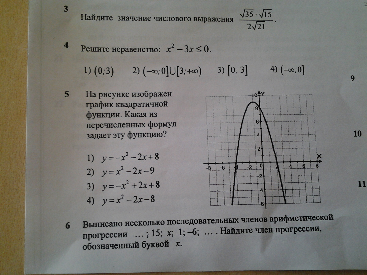 5. Ветви вниз, значит коэффициент при x^2 отрицательный (ответ 1 либо 3). Пересечения с осью OX - корни квадратного уравнения. То есть