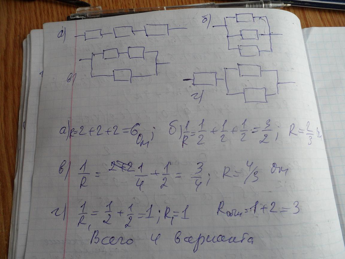 Даны три резистора сопротивлением по 2 Ом каждый.Сколько разных значений сопротивления можно получить,соединяя резисторы по-разному?