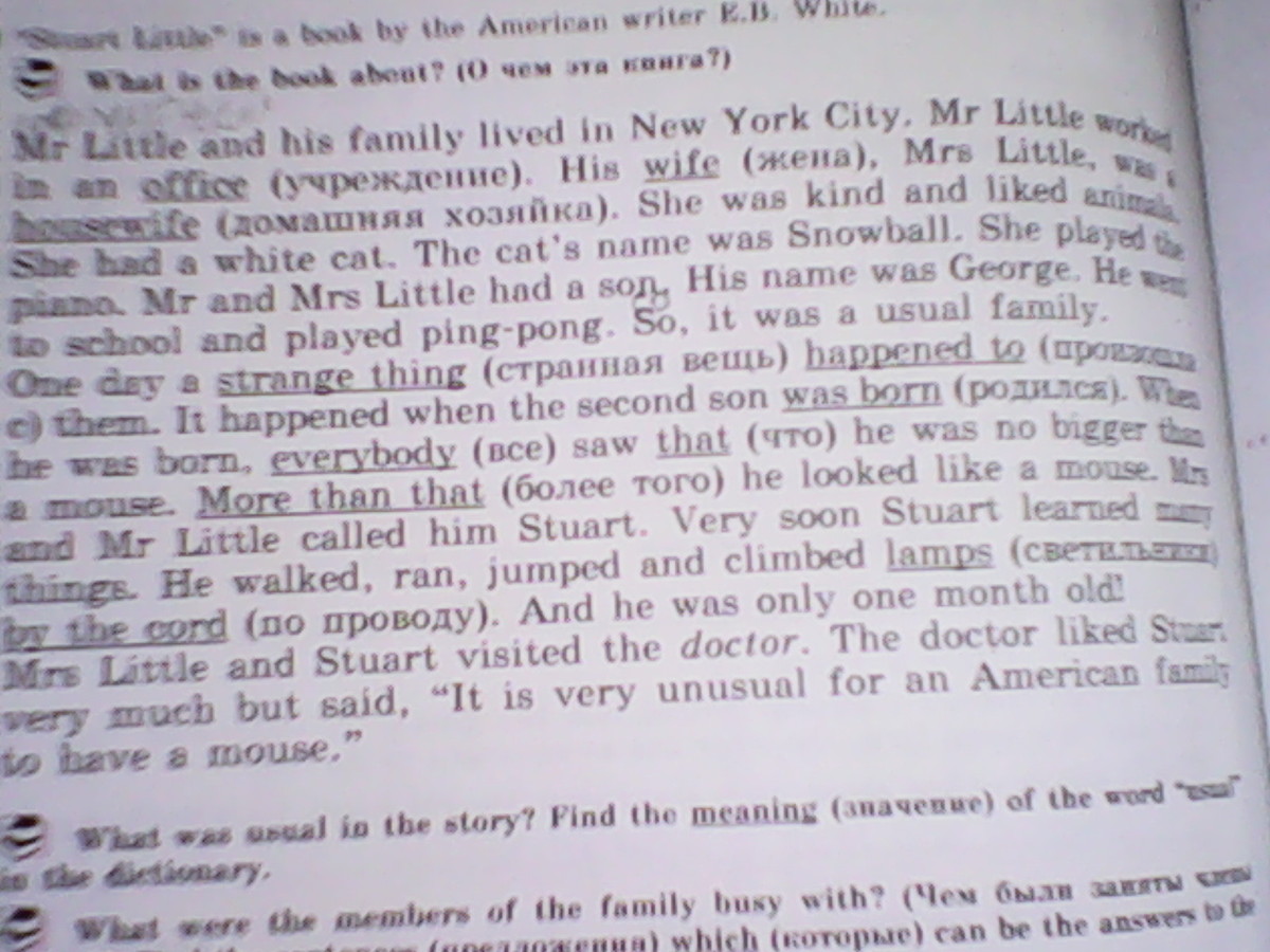 Мистер Литтл и его семья жили в Нью-Йорке. Мистер Литтл работал в офисе. Его жена, миссис Литтл, была домохозяйкой. Она была добродушной и любила животных. У неё была белая кошка. Её звали Снежок. Также она играла на пианино. У мистера и миссис Литтл был сын. Его звали Джордж. Он ходил в школу и играл в пинг-понг. В общем, это была обычная семья.