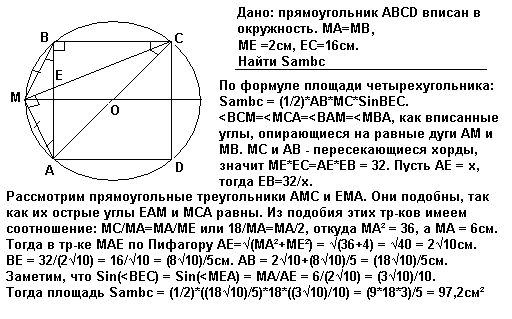 Около прямоугольника АВС описали окружность. На окружности взята точка М, равноудаленная от вершины А и В. Отрезки А и В. Отрезки МС и АВ пересекаются в точке Е. Найти площадь четырехугольника АМВС, если МЕ=2, ЕС= 16.