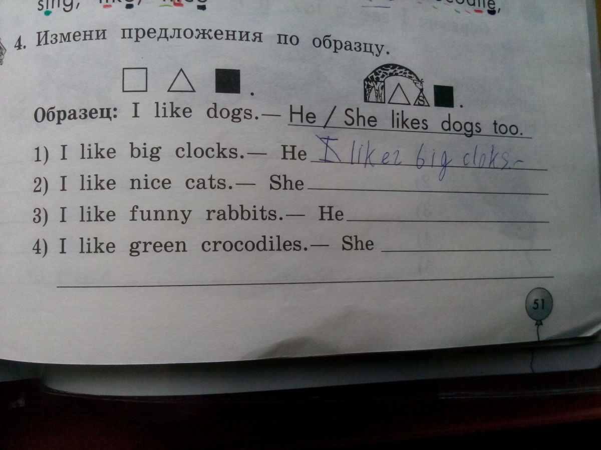 she/ he likes nice cats. she/ he likes funny rabits. she/ he likes green crokodiles.