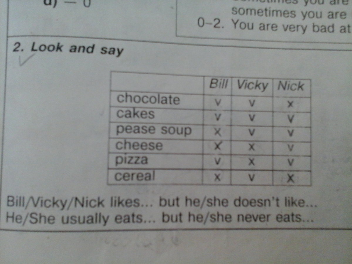 2. Vicky likes chocolate, cakes, pease soup and cereal but doesn't like cheese and pizzza.