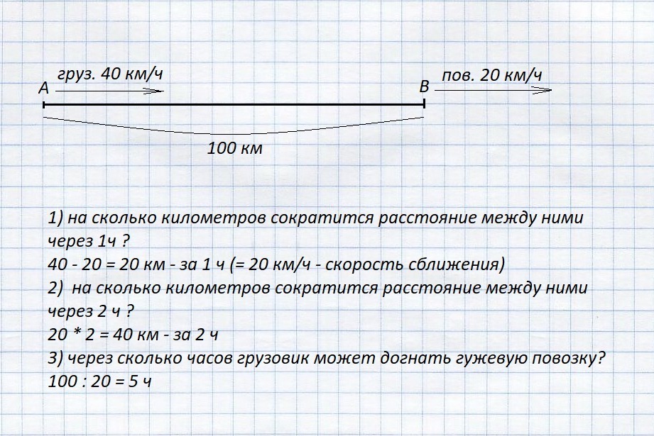 из пунктов А и Б,расстояние между которыми равно 100км,одновременно в одном направлении выехали грузовик и гужевая повозка.Скорость грузовика 40км/ч, а скорость гужевой повозки20км/ч. На сколько километров сократится расстояние между ними через 1ч?через 2ч? Через сколько часов грузовик может догнать гужевую повозку?