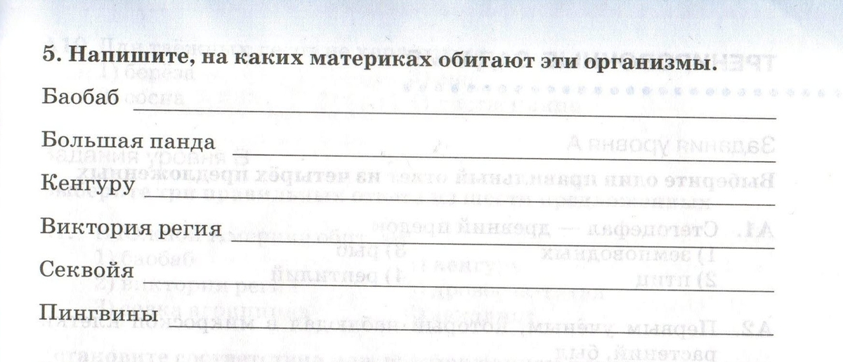 Баобаб-в Африке .Большая коала-в Евразии . Кенгуру -в Австралии . Виктория регия -в Южной Америке . Секвоя- в Северной Америке . Пингвины в Антарктиде