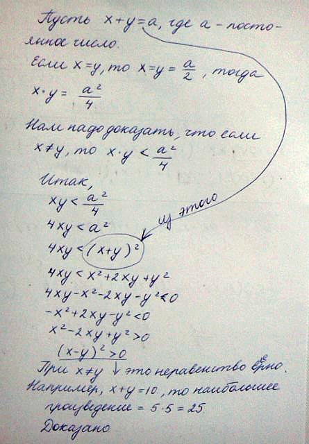 докажите, что если сумма двух положительных чисел постоянна, то их произведение наибольшее, когда эти числа равны.