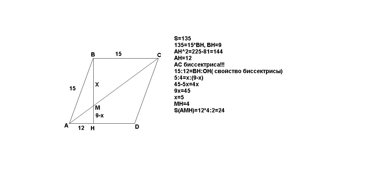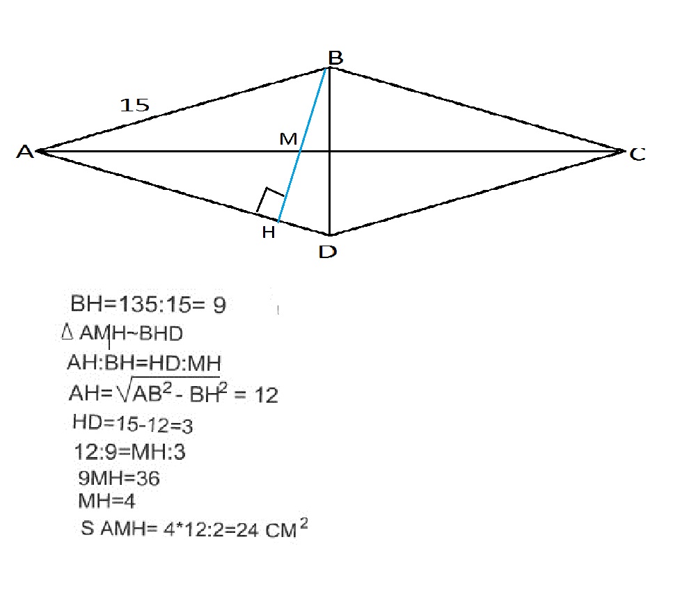 В ромбе ABCD из вершины тупого угла B проведена высота BH к стороне AD. Она пересекает диагональ AC в точке M. Сторона ромба равна 15, а его площадь равна 135. Найдите площадь треугольника AMH.