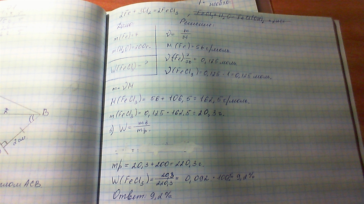 Железо массой 7г вступило в реакцию с хлором. Полученный хлорид растворили в 200г воды. Вычислите массовую долю (%) соли в полученном растворе. ПРОВЕРЬТЕ ПОЖАЛУЙСТА!