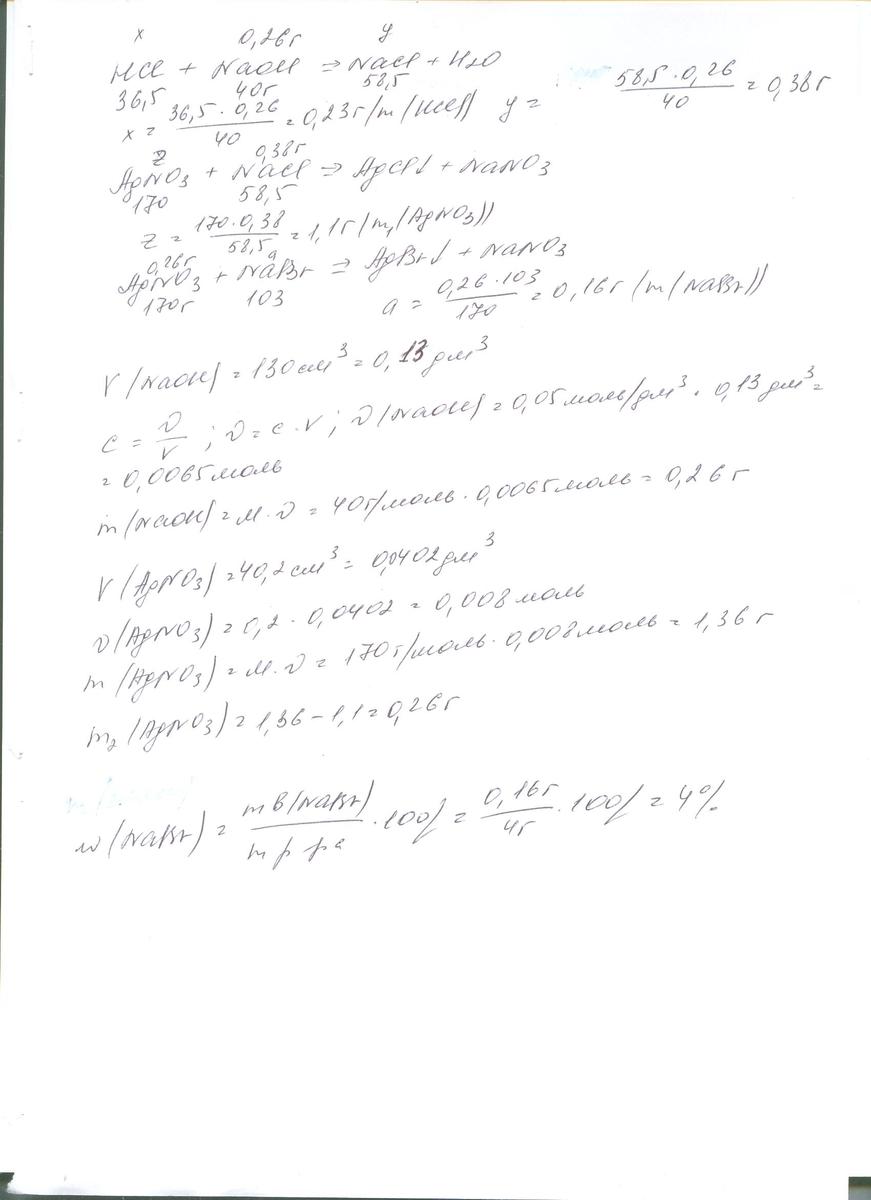 для нейтрализации раствора массой 4 г содержащего HCl и NaBr требуется раствор объемом 130 см куб с концентрацией NaOH 0,05 моль/дм куб. для полного осаждения всех ионов Cl и Br в полученном нейтральном растворе необходимо добавить раствор объемом 40.2 см куб с концентрацией AgNO3 0,2 моль/дм куб. НАЙТИ массовую долю NaBr в исход. растворе!!!!!