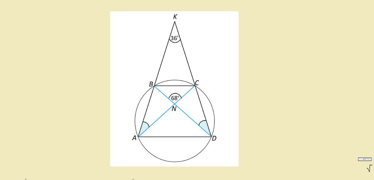 четырехугольник ABCD вписан в окружность.Лучи AB и DC пересекаются в точке K,а диагонали AC и BD пересекаются в точке N. Угол BNC равен 68 градусов. а угол AKD равен 36 градусов.Найдите угол BAC.