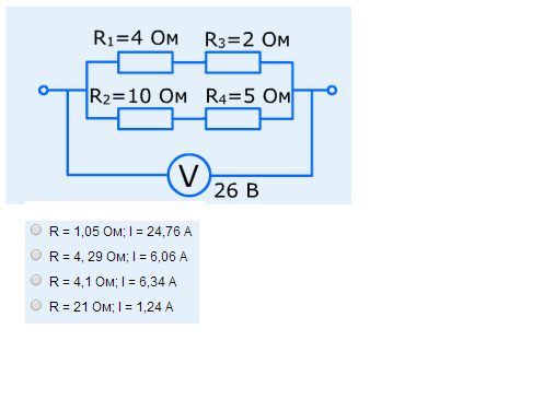 Дано U=26 В R1+R2=6 Ом R3+R4=15 Ом I- ? R - ?