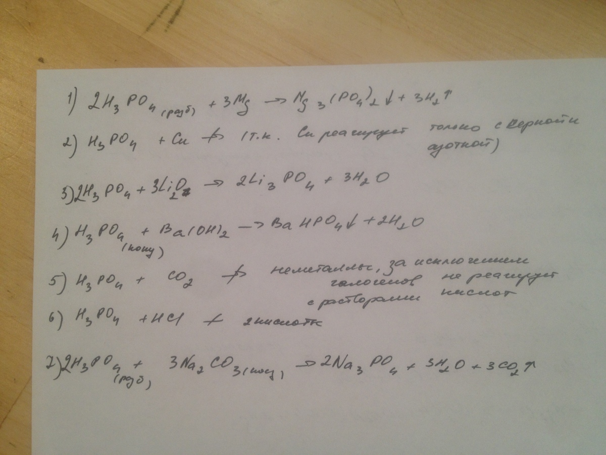 Из данного перечня веществ выберете те , вещества с которыми взаимодействует фосфорная кислота : магний , медь, оксид лития , гидроксид бария , оксид углерода(4), соляная кислота, карбонат натрия. напишите реакции