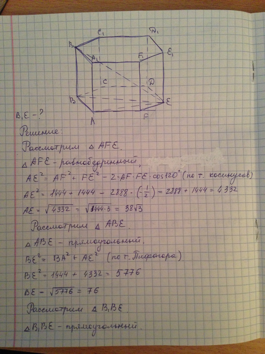 В правильной шестиугольной призме ABCDEFA1B1C1D1E1F1 все ребра равны 38. Найдите расстояние между точками B1и E