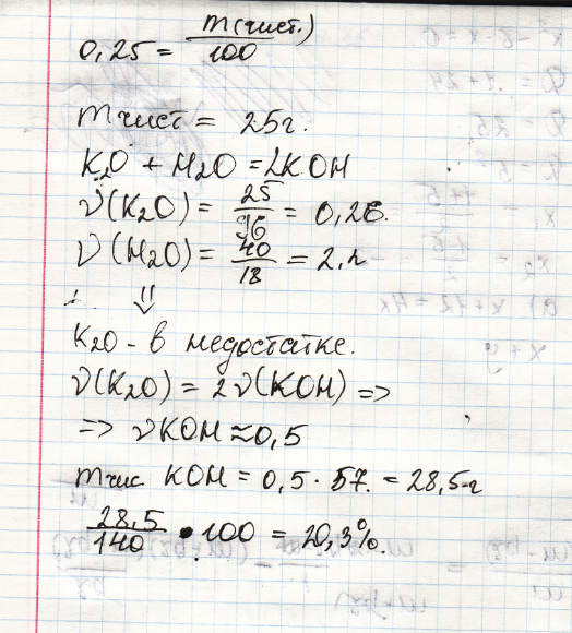 к 100 г раствора, массовая доля гидроксида калия в котором 0,25, добавлено 40 г воды. какова массовая доля щелочи в получившемся растворе?