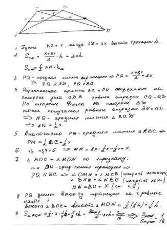 В трапеции ABCD основание AD в три раза больше основания BC. Диагонали трапеции пересекаются в точке O. Средняя линия трапеции пересекает диагонали в точках M и N. Найдите отношение площади треугольника MON к площади трапеции. Ответ должен быть 1:16.