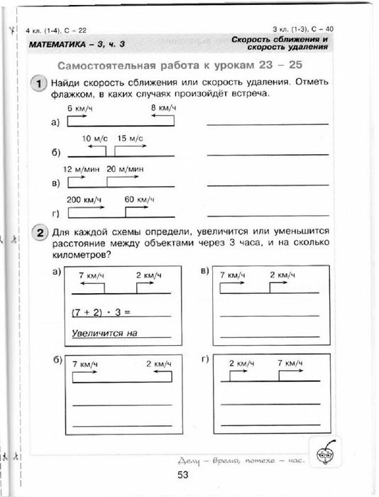 Найди скорость сближение или скорость удаление. Отметь флажок, в каких случаях произойдёт встреча.
