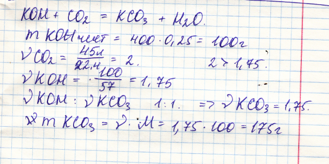 В 400 г 25% раствора едкого калия растворили 45 л углекислого газа. Рассчитать массу образовавшей соли.