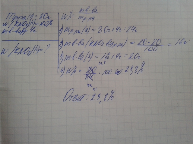 К 80г раствора, в котором массовая доля нитрата калия равна 20%, добавили 4г соли. Вычислите массовую долю нитра калия в полученном растворе.