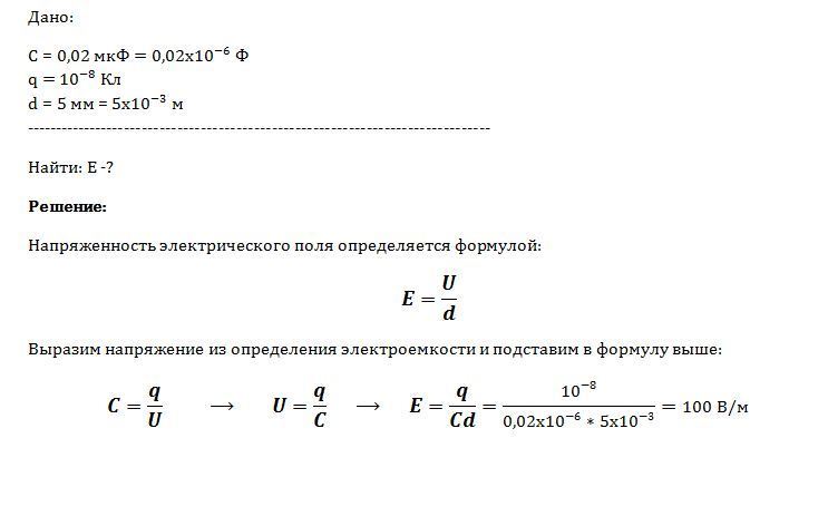 Конденсатор электроёмкостью 0,02 мкФ имеет заряд 10^-8кл. Какова напряжённость электрического поля между его обкладками, если расстояние между пластинами конденсатора составляет 5 мм
