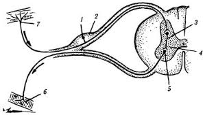 от рецептора передаётся к чувствительному(1), от чувствительного к цнс там по вставочному(3) и по двигательному(5) к органам тела