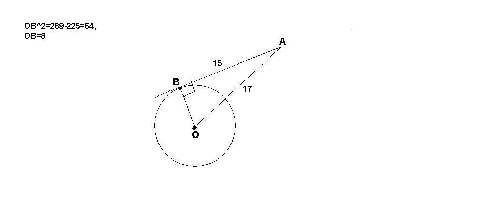 Из точки А, лежащей вне окружности, проведена к ней касательная АВ, длина которой равна 15. расстояние от центра окружности до точки а равно 17. Найдите радиус окружности.