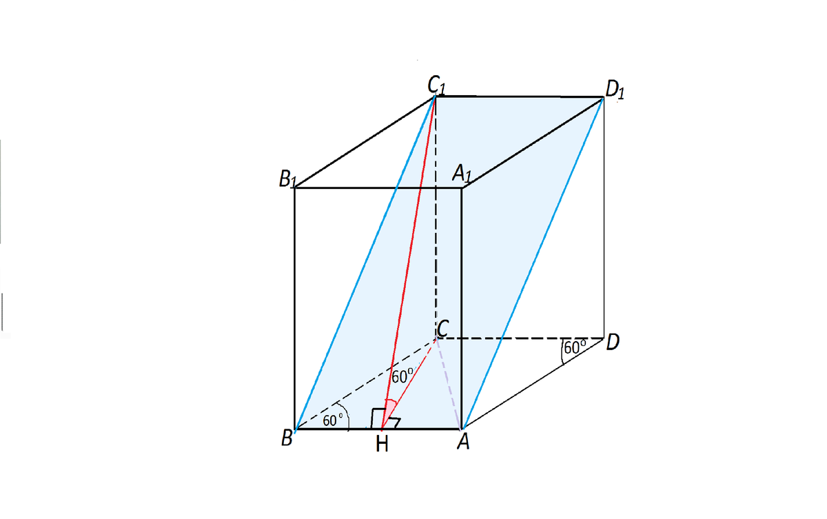(Здесь нужно заметить, что не диагональ боковой грани ВС1 составляет угол 60°, а перпендикуляр С1Н к АВ)