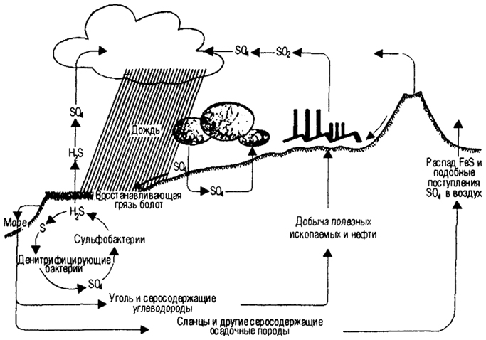 Здесь хорошо просматриваются многие основные черты биогеохимического круговорота.Обширный резервный фонд в почве и отложениях, меньший в атмосфере.Ключевую роль в быстро обменивающемся фонде играют специализированные микроорганизмы, выполняющие определенные реакции окисления или восстановления. Благодаря процессам окисления и восстановления происходит обмен серы между доступными сульфатами (SO4) и сульфидами железа, находящимися глубоко в почве и осадках. Специализированные микроорганизмы выполняют реакции: H2S → S → SO4 -бесцветные, зеленые и пурпурные серобактерии; SO4 → H2S (анаэробное восстановление сульфата) - Desulfovibrio; H2S → SO4(аэробное окисление сульфида) - тиобациллы; органическая S в SO4 и H2S - аэробные и анаэробные гетеротрофные микроорганизмы соответственно. Первичная продукция обеспечивает включение сульфата в органическое вещество, а экскреция животными служит путем возвращения сульфата в круговорот.Микробная регенерация из глубоководных отложений, приводящая к движению вверх газовой фазы H,S.Взаимодействие геохимических и метеорологических процессов - эрозия, осадкообразование, выщелачивание, дождь, абсорбация-десорбция и др. - с такими биологическими процессами, как продукция и разложение.Взаимодействие воздуха, воды и почвы в регуляции круговорота в глобальном масштабе.В целом экосистеме по сравнению с азотом и фосфором требуется меньше серы. Отсюда сера реже является лимитирующим фактором для растений и животных. Вместе с тем круговорот серы относится к ключевым в общем процессе продукции и разложения биомассы. К примеру, при образовании в осадках сульфидов железа фосфор из нерастворимой формы переводится в растворимую и становится доступным для организмов. Это подтверждение того, как один круговорот регулируется другим.