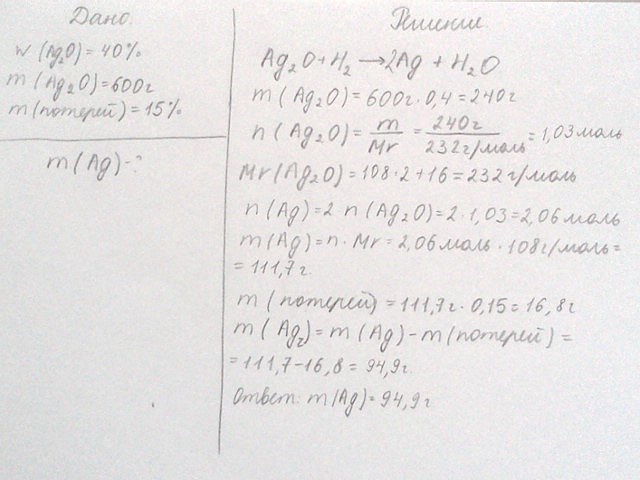 МОжет быть восстановлении, а не окислении? Ag2O+H2->2Ag+H2O. m(Ag2O,100%)=m(Ag2O,40%)*40%/100%=600*40/100=240г, n(Ag2O)=m/M=240/232=1,03моль. n(Ag,теор)=2n(Ag)=2,06моль, n(Ag,практ)=n(Ag,теор)*85%/100%=2,06*85/100=1,75моль, m(Ag,практ)=n*M=1,75*108=189,1г. Ответ: m(Ag)=189,1г.