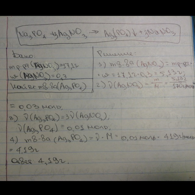Вычислите массу осадка, который образуется при добавлении избытка раствора фосфата натрия к 17,1 г 30 процентного раствора нитрата серебра.