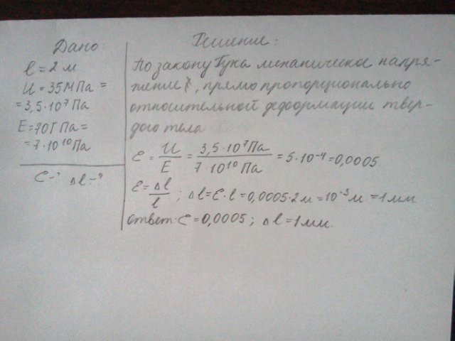 при растяжении алюминиевой проволоки длиной 2 м в ней возникло механическое напряжение 35 МПв. Найти относительное и абсолютное удлинения.
