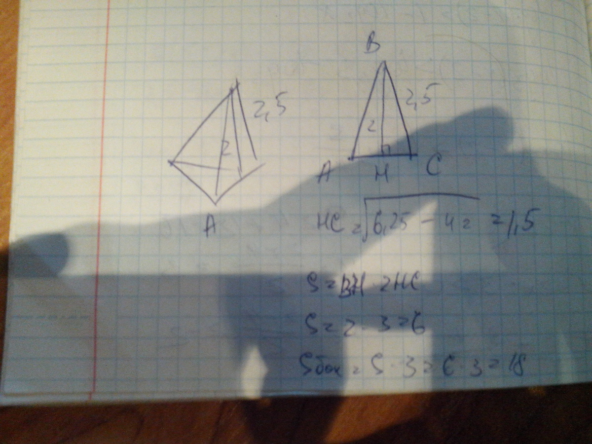 Боковые ребра правильной треугольной пирамидыравны 2,5, а апофема боковой грани равна 2. Найдите площадь боковой поверхности этой пирамиды.
