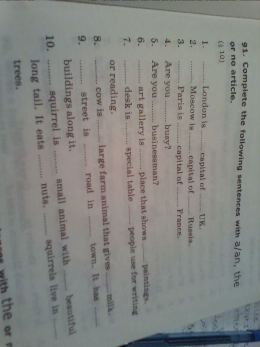 91. 1)London is the capital of UK. 2)Moscow is the capital of Russia 3)Paris is the capital of France 4)Are you busy? 5)Are you businessman? 6)The art gallery is the place that shows paintings