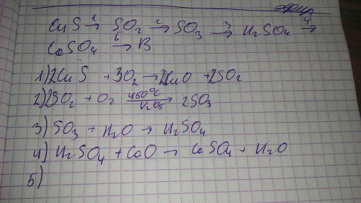Осуществить схему превращения веществ:CuS →SO2 → SO3 → H2SO4 → CaSO4 → B
