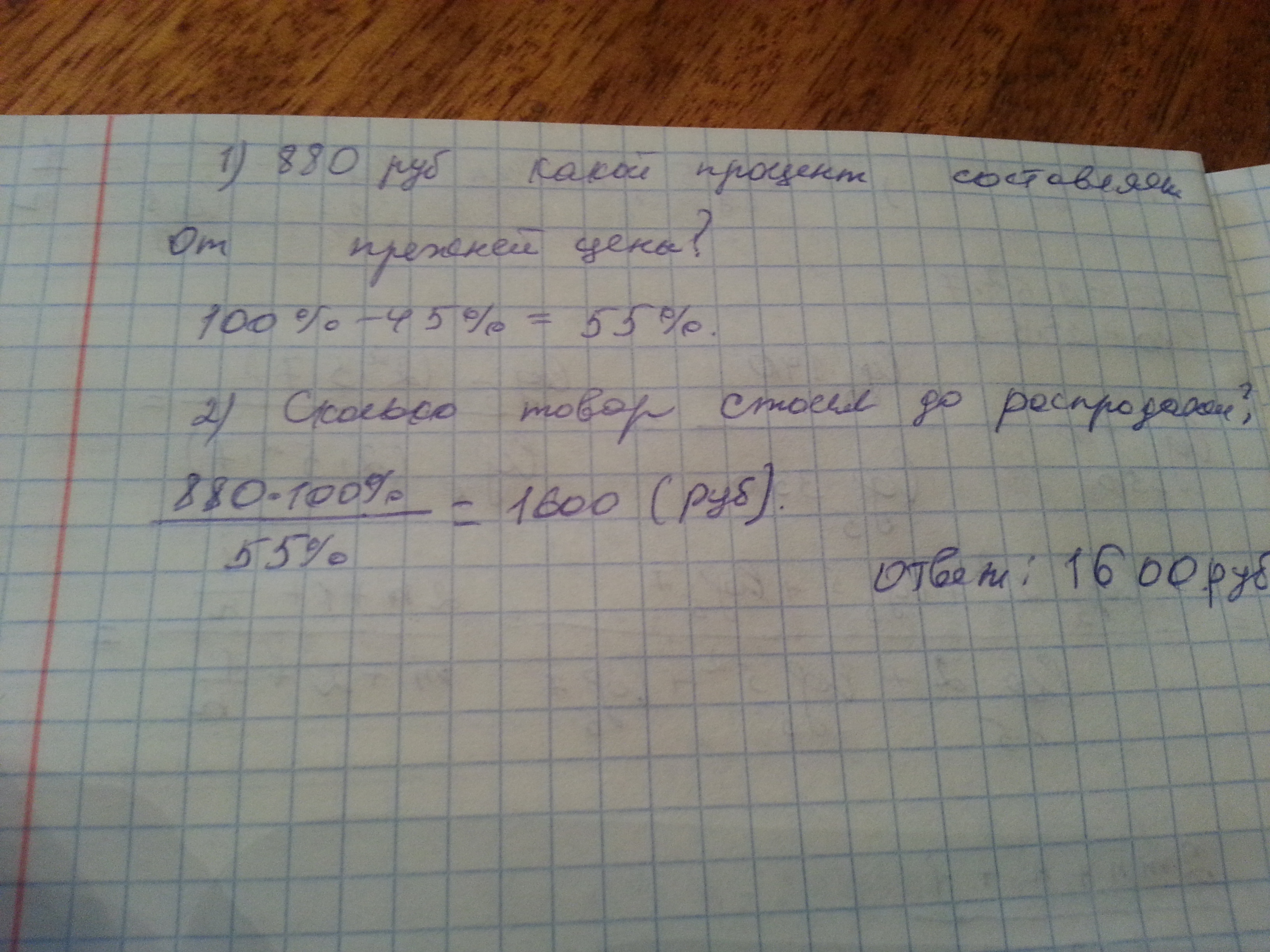 Товар на распродаже уценили на 45%, при этом он стал стоить 880 р. Сколько рублей стоил товар до распродажи?