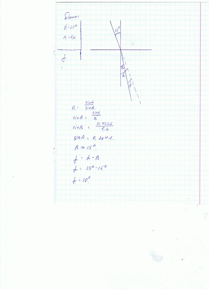 рассчитайте на какой угол отклонится луч света от своего первоначального направления, при переходе из воздуха в стекло, если угол падения равен 25 градусов