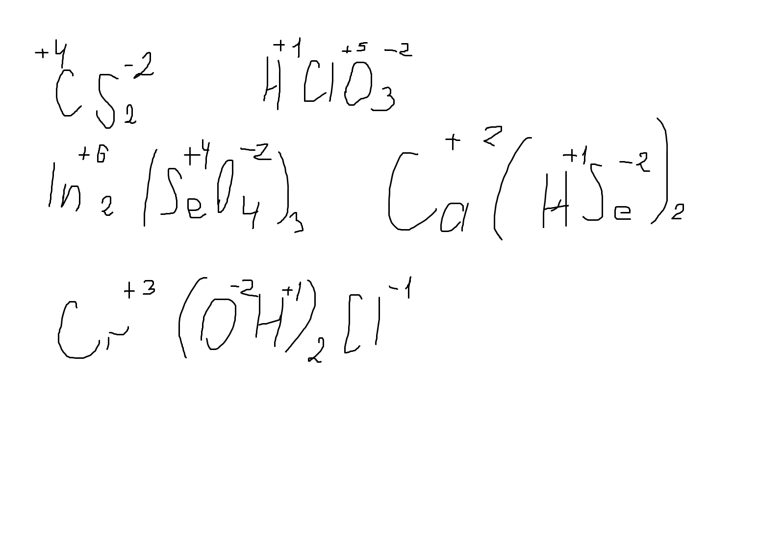 Определите степени окисления элементов в соединениях:CS2,HClO3, In2(SeO4)3, Ca(HSe)2, Cr(OH)2Cl;