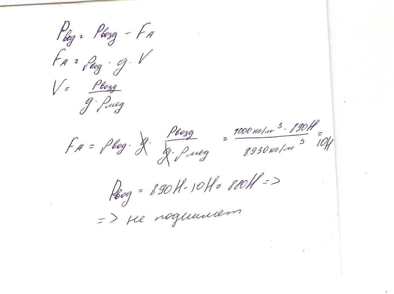 Спортсмен способен развить силу 800H.Сможет ли он удержать в воде медное тело,которое в воздухе весит 890H?