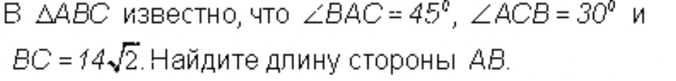 В треугольнике ABC известно, что угол BAC=45(градусов), угол ACB=30 (градусов) и BC= 14 корня 2 . Найдите длину стороны AB.