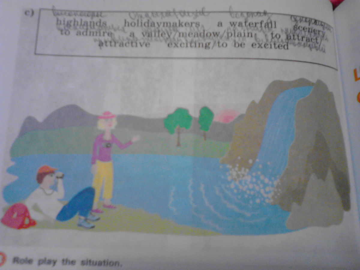 Необходимые слова: highlands, holidaymakers, a waterfall, scenery, to admire ,a valley,meadow, plain, to attract, attractive, exciting, to be excited.